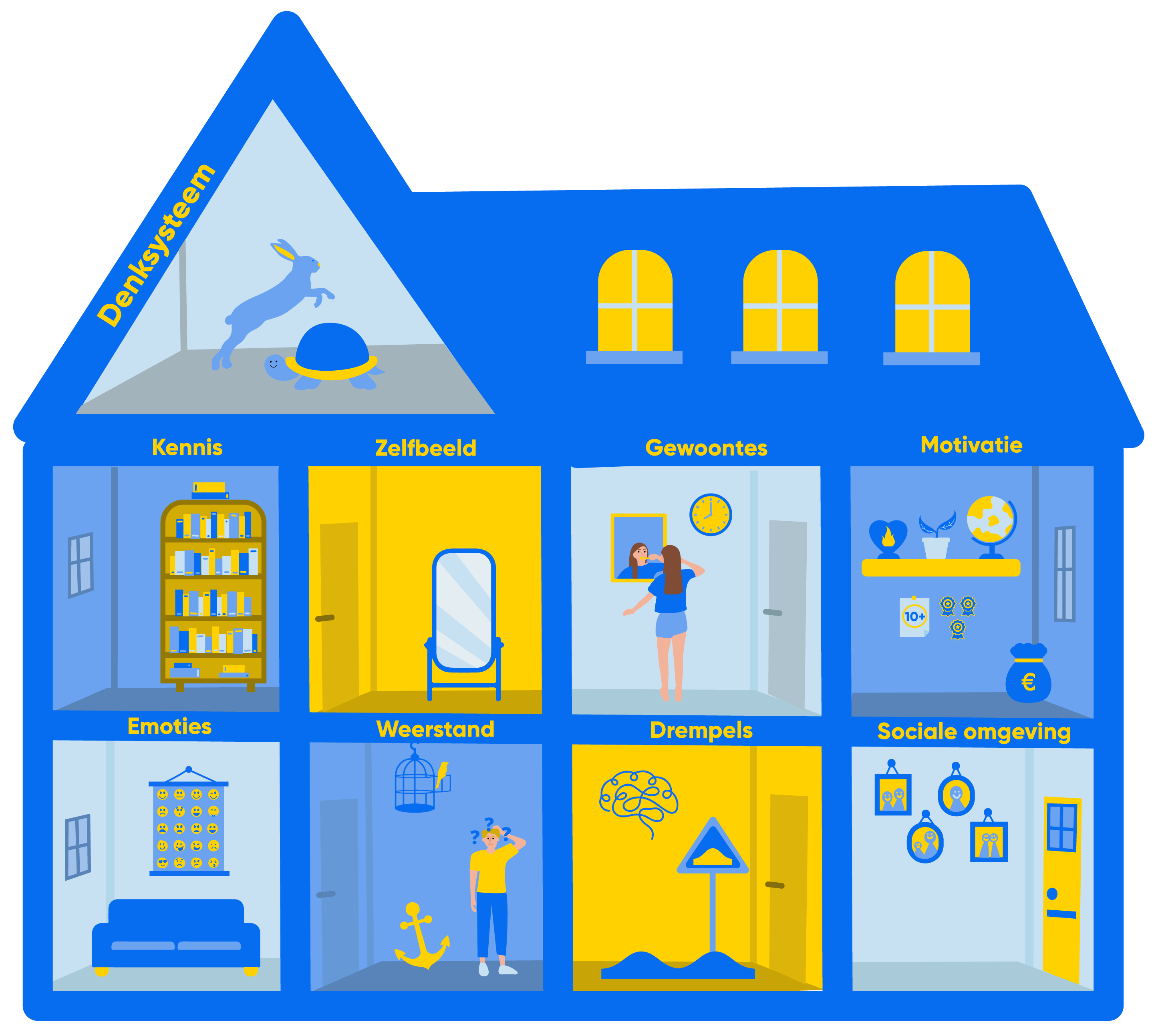 Gedrag komt nooit voort uit één oorzaak. In dit traject gebruik ik het gedragsfactorenhuis om inzicht te geven in welke factoren gedrag sturen en welke sleutels je dus kunt gebruiken. Elke kamer in het huis staat voor een gedragsfactor: denk aan gewoontes, motivatie, emoties, weerstand of de sociale omgeving. Soms helpt een factor mee aan gewenst gedrag, soms werkt het juist tegen. Door goed te kijken welke kamers invloed hebben op het gedrag van de doelgroep kun je gericht ingrijpen. Het gedragsadvies is dus geen optelsom van theorie, maar een gerichte selectie van wat echt werkt.